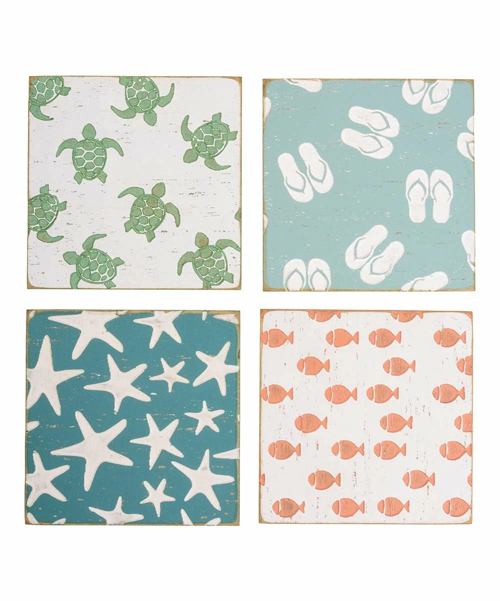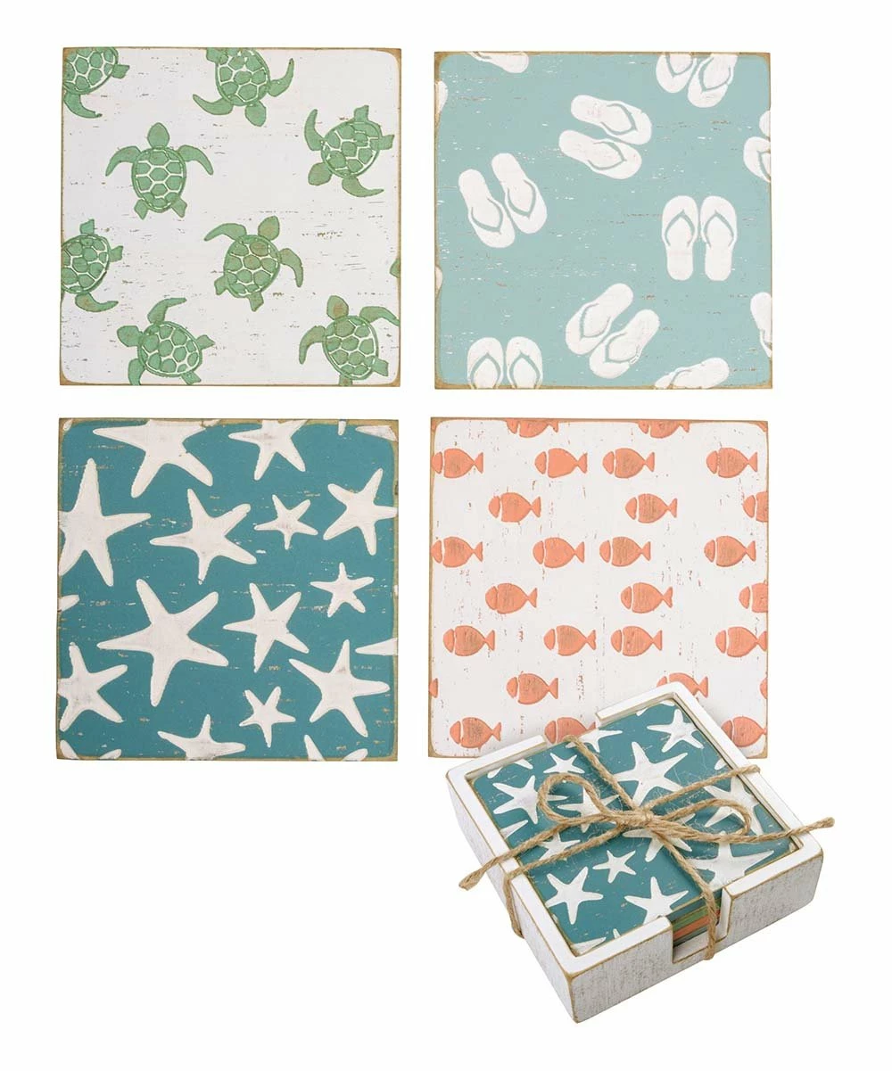 - Includes one blue starfish coaster, one blue flip-flops coaster, one green turtles coaster and one pink fish coaster, coaster holder and jute rope (six pieces total)