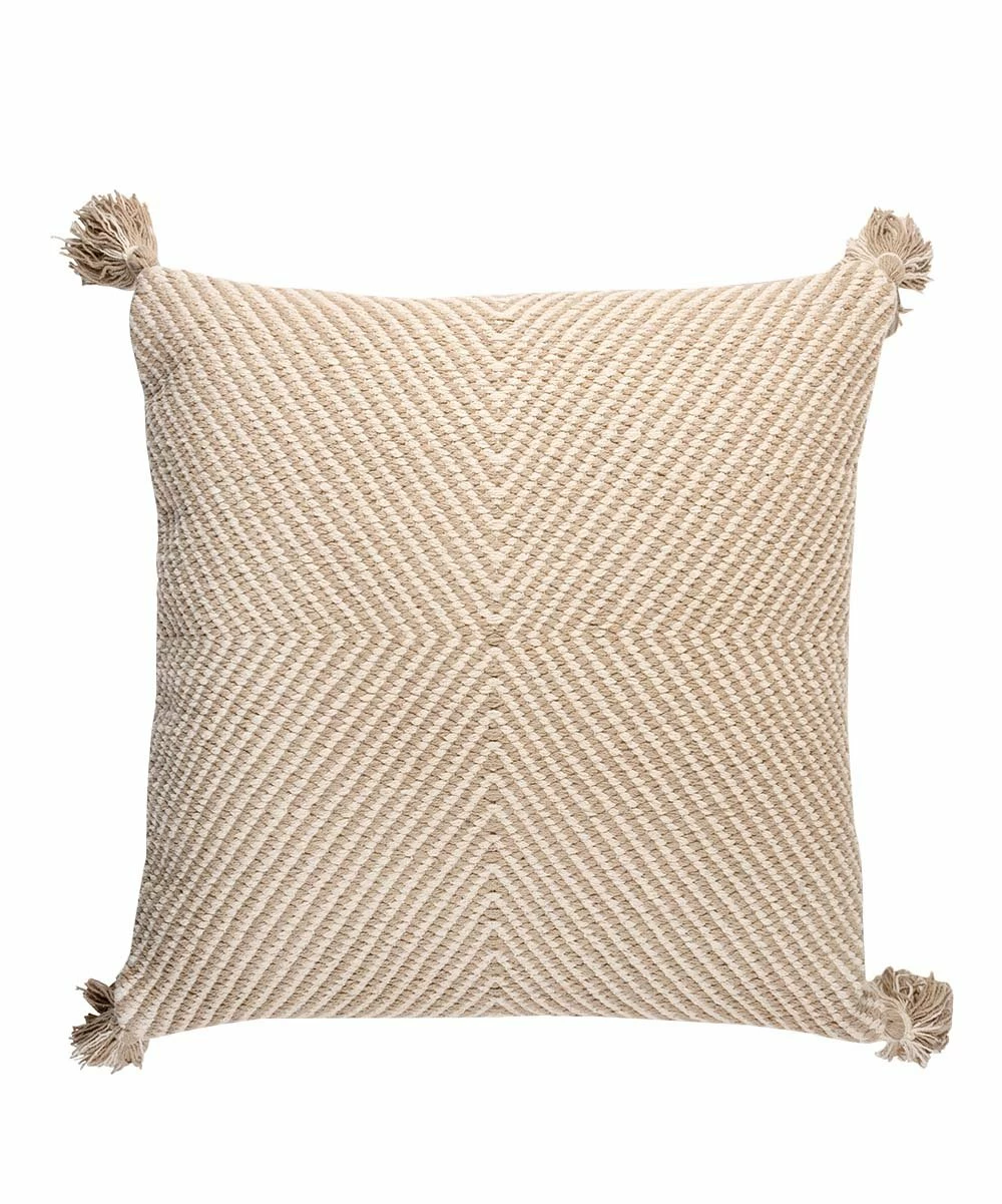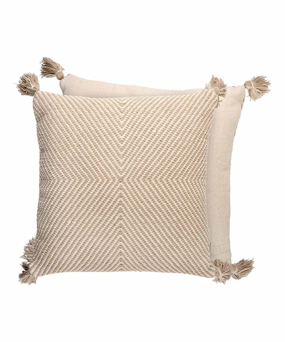 Add a comfortable finish to the sofa or bed with this cotton throw pillow featuring geometric detailing and tassel accents at each corner.