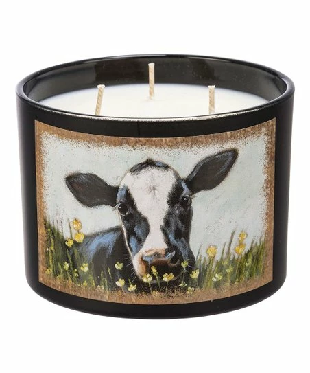 Create an enchanting atmosphere in your home when you light this candle, featuring colorful cow artwork on its glass jar.