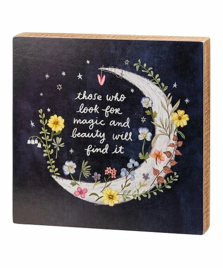Accent tabletop or shelf spaces with this box sign’s floral moon design and wholesome message.