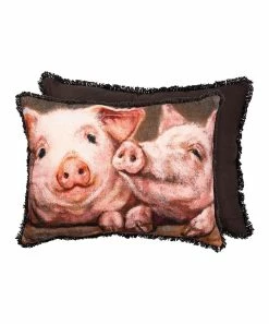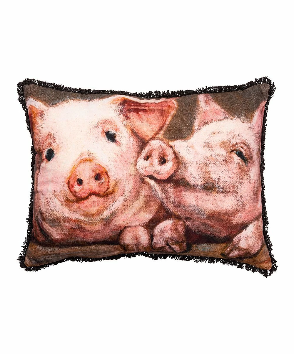 Nourish your farmhouse-inspired décor by planting this throw pillow, boasting a fringe frame around two smiling pig pals.