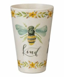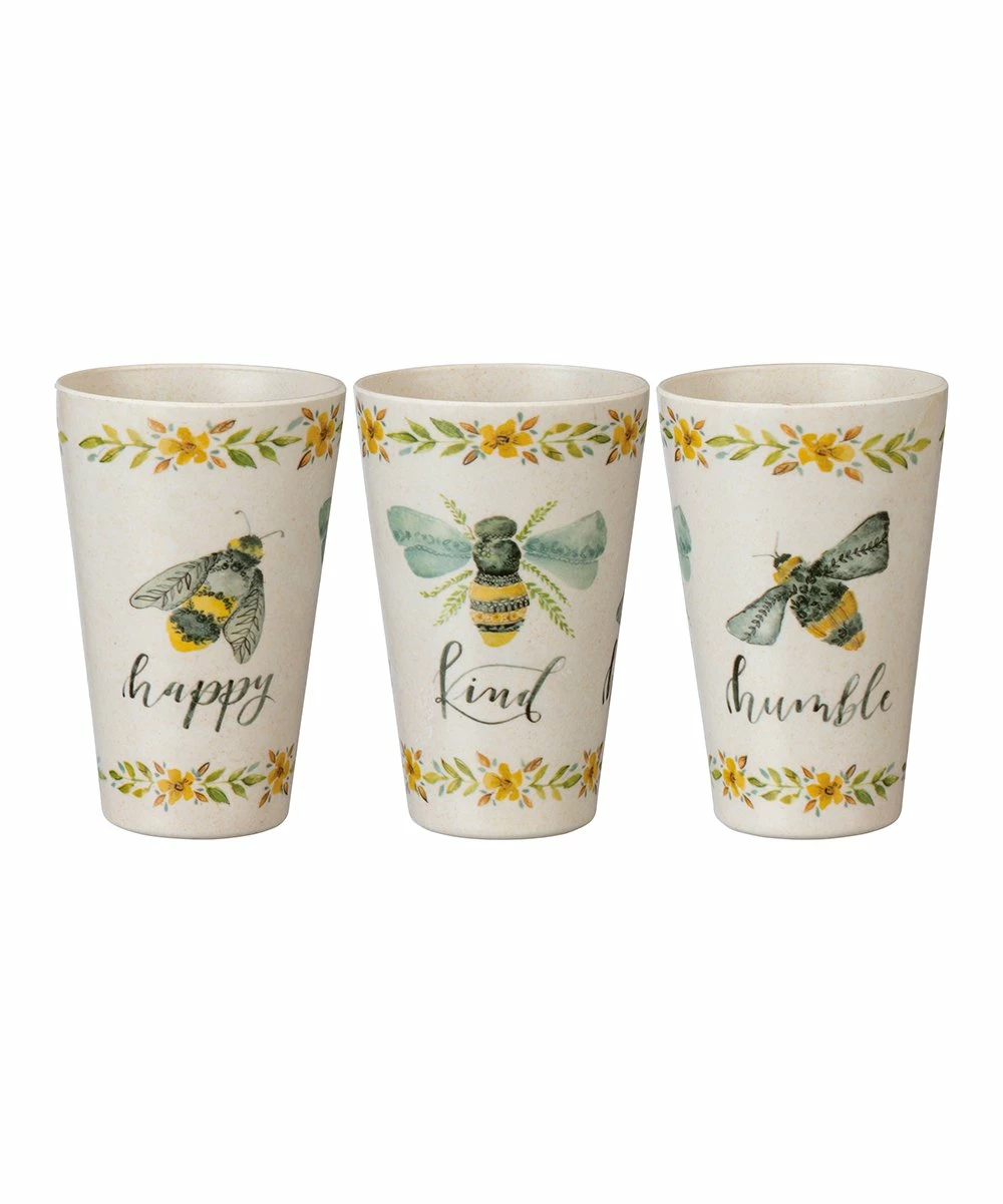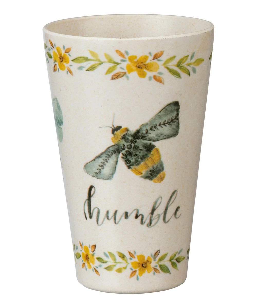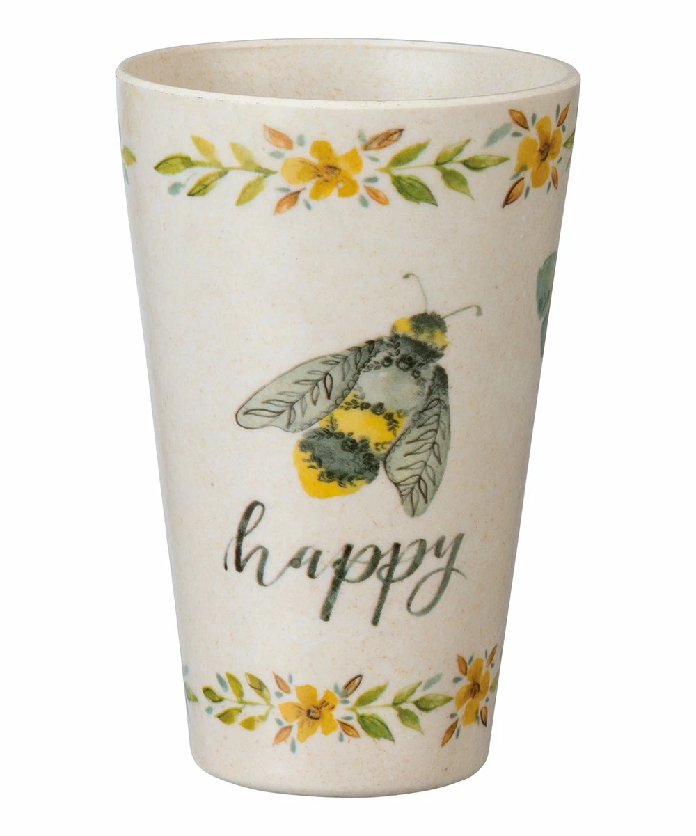 Bring charm to your drinkware collection with this cup that features colorful floral and bee designs.