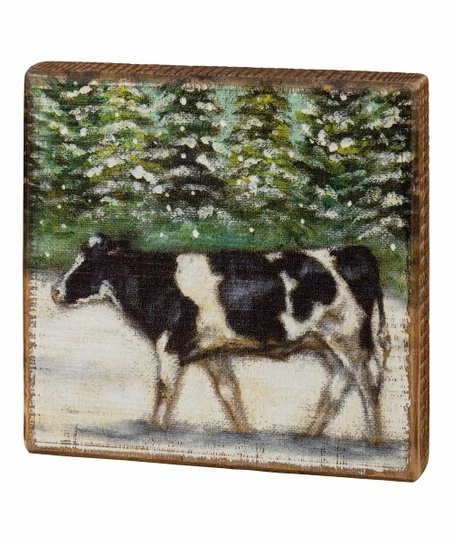 Box sign featuring a sturdy wood construction and a print of a cow in a snowy outdoor scene.