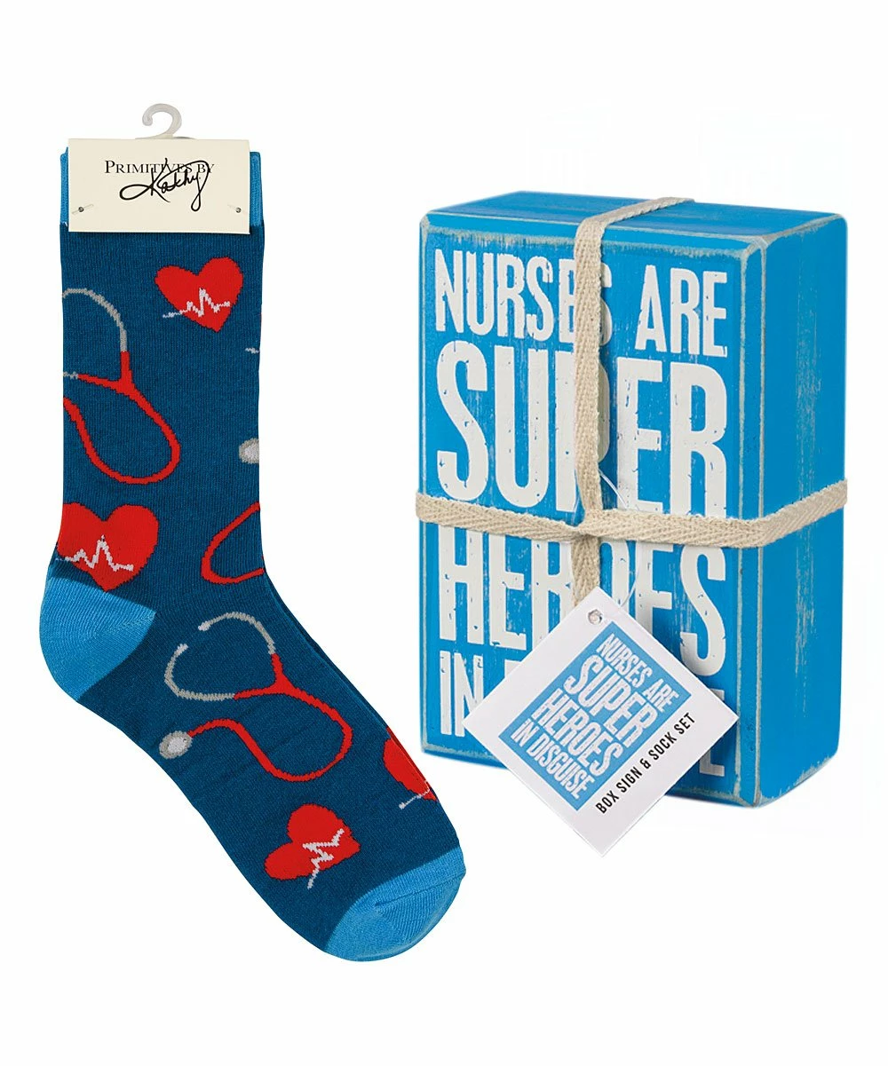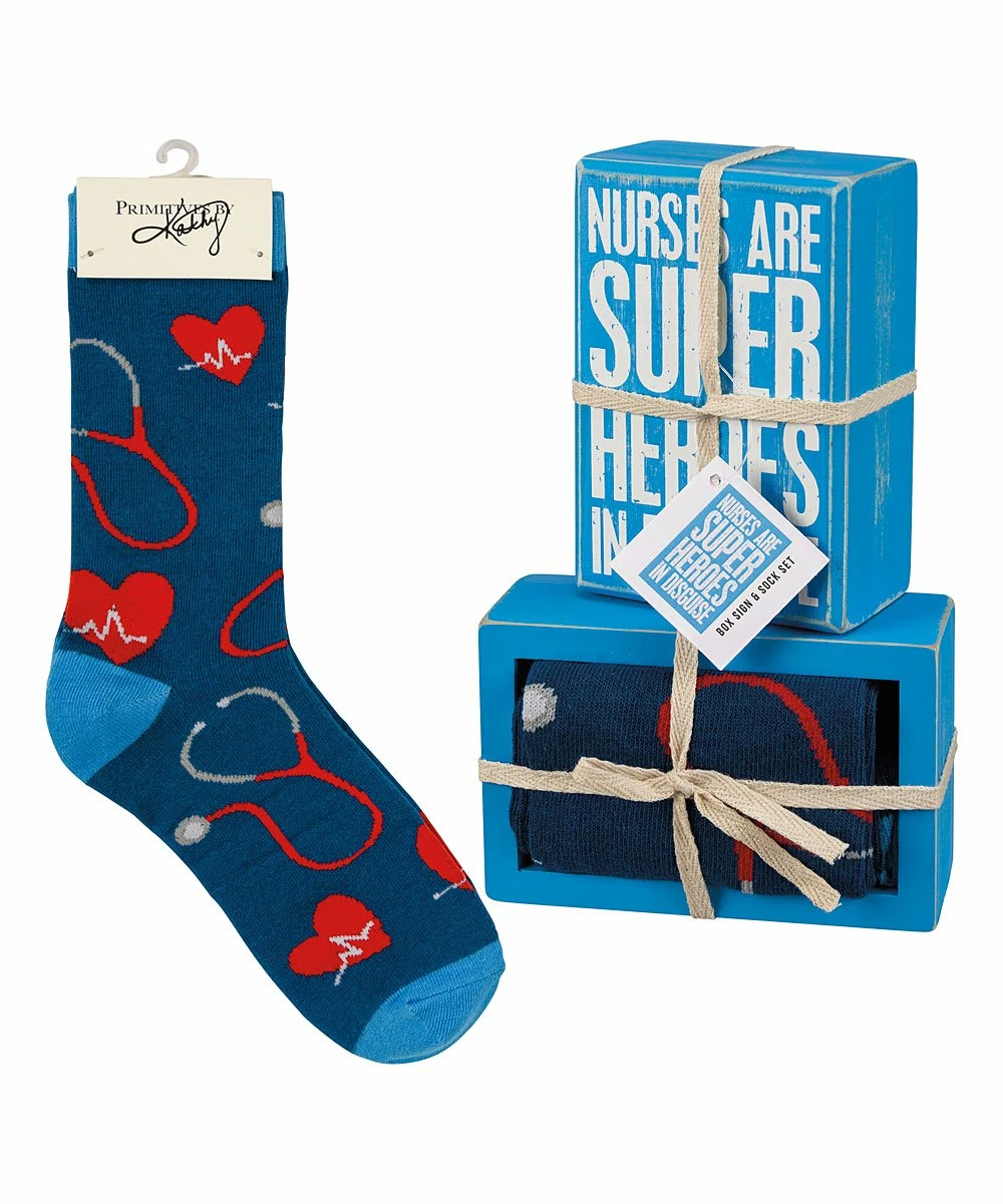 - Includes navy stethoscope socks and blue box sign (two pieces total)
