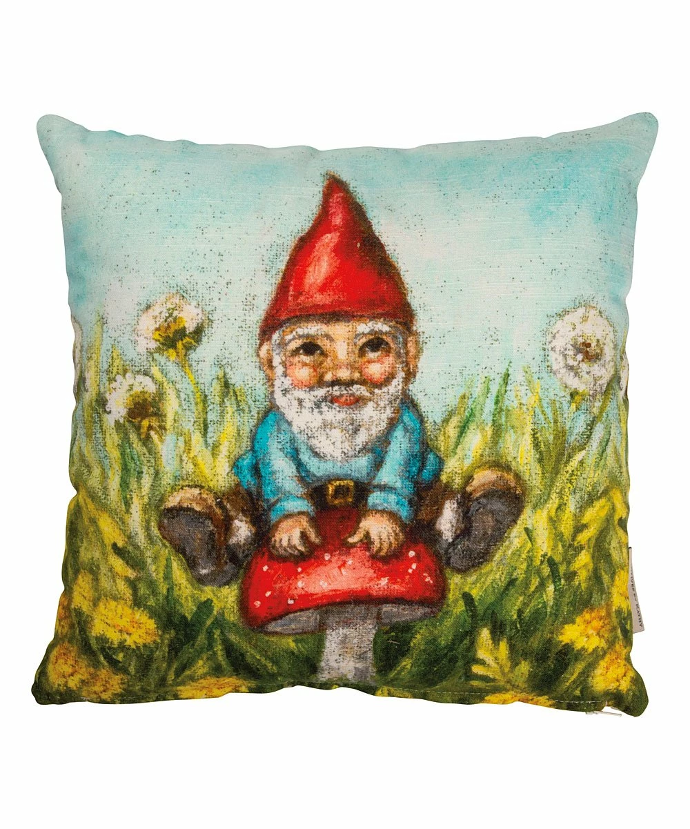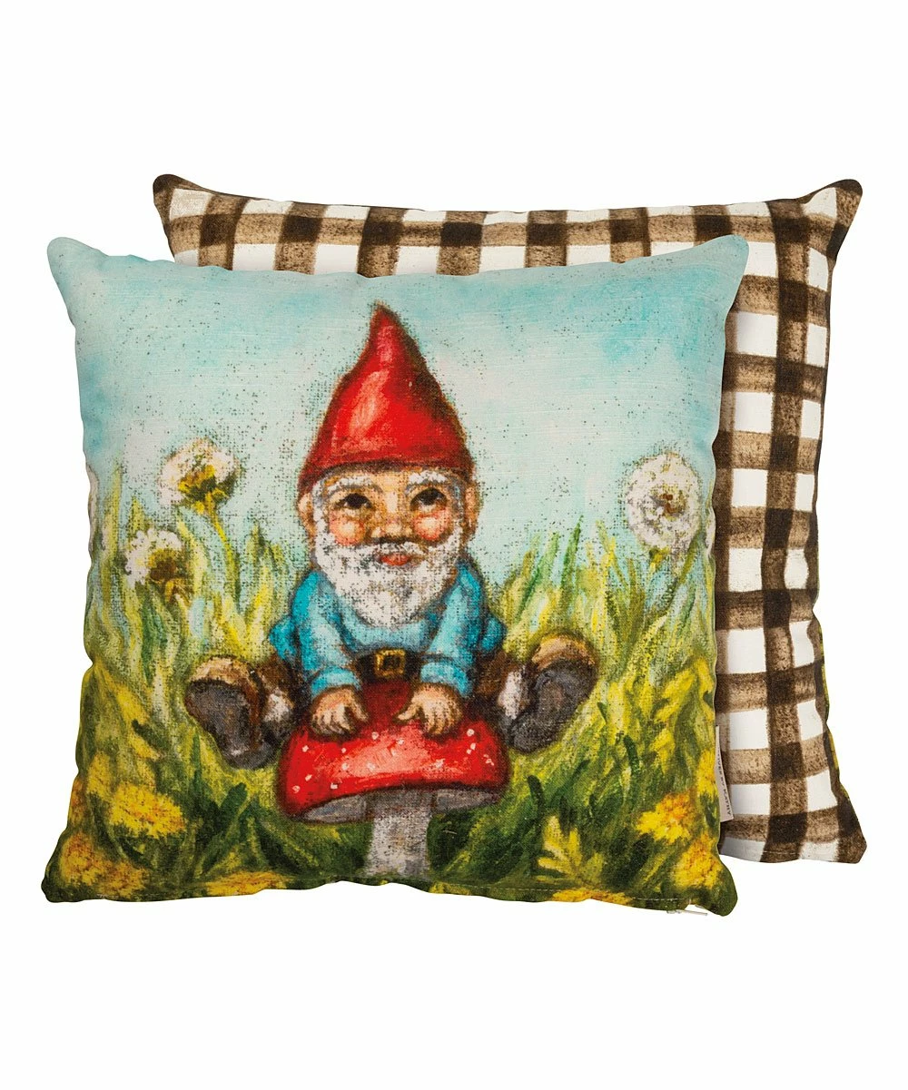 Give your home some playful spirit by displaying this plush cotton throw pillow that showcases a whimsical gnome motif. A plaid design on the back gives you two ways to rest it.