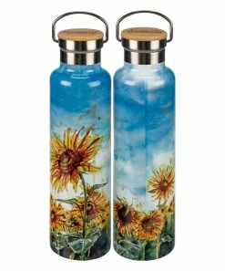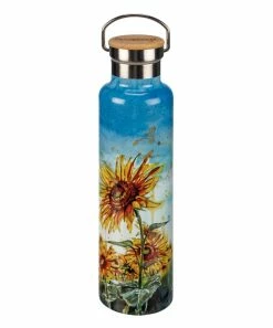 Stay hydrated throughout the day when you use this stainless steel water bottle boasting a vibrant sunflower graphic and bamboo top.