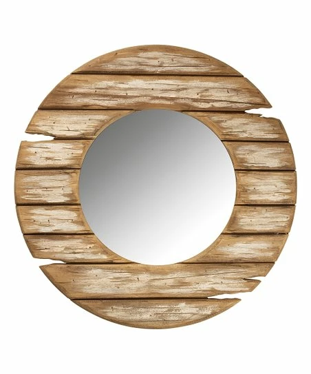 This round mirror features a weathered plank-style frame for a rustic finishing touch.