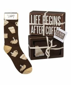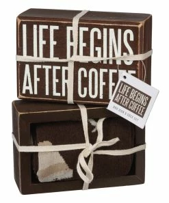 - Includes brown block sign and brown coffee socks