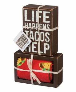 - Full graphic text (block sign): Life happens, tacos help.