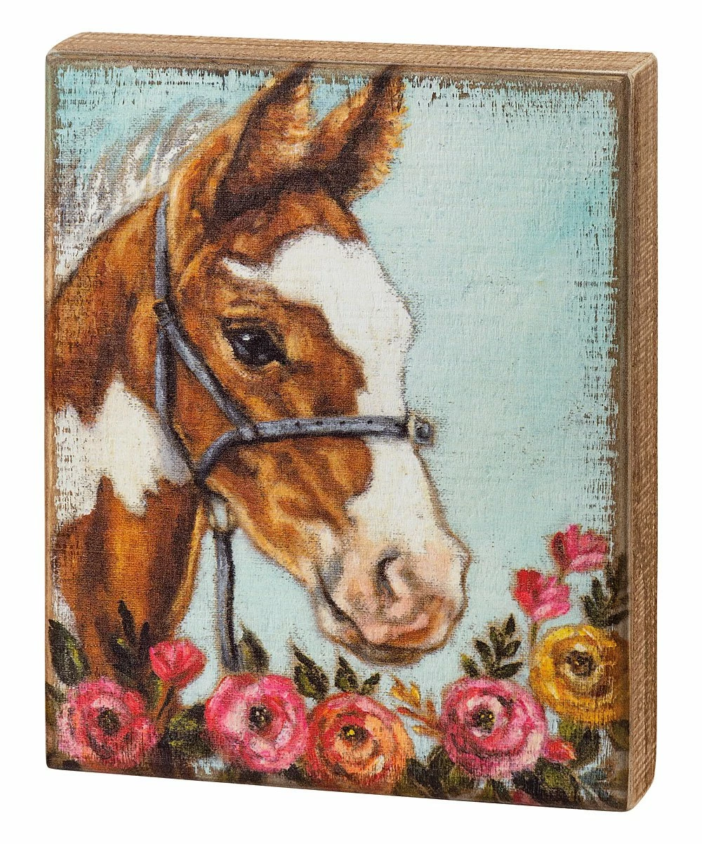 Beautify your table or shelf with this wooden box sign decked out in colorful floral equine graphic.
