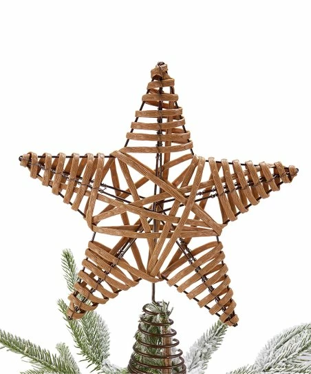 Star-shaped tree topper composed of wrapped rattan.