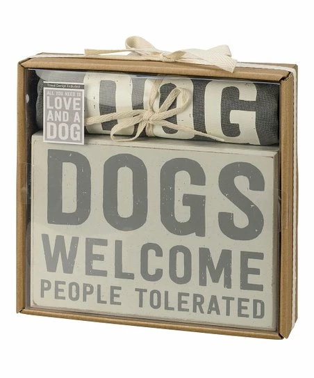 Let your décor speak for you with this matching two-piece set that features a block sign and a dish towel each embellished with a humorous message made for dog lovers.