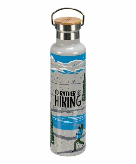 Stainless steel water bottle with an insulated design and a patterned exterior.