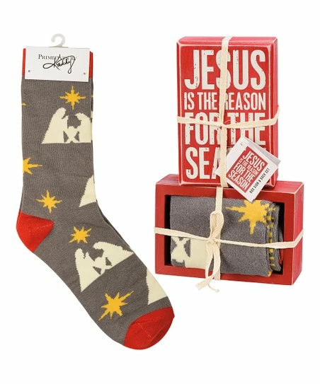 - Includes red and white box sign and gray and white nativity scene crew socks (two pieces total)