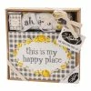 This matching block sign and dish towel feature gingham borders and positive messages.