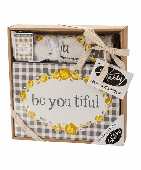 - Includes gray and yellow block sign and dish towel (two pieces total)