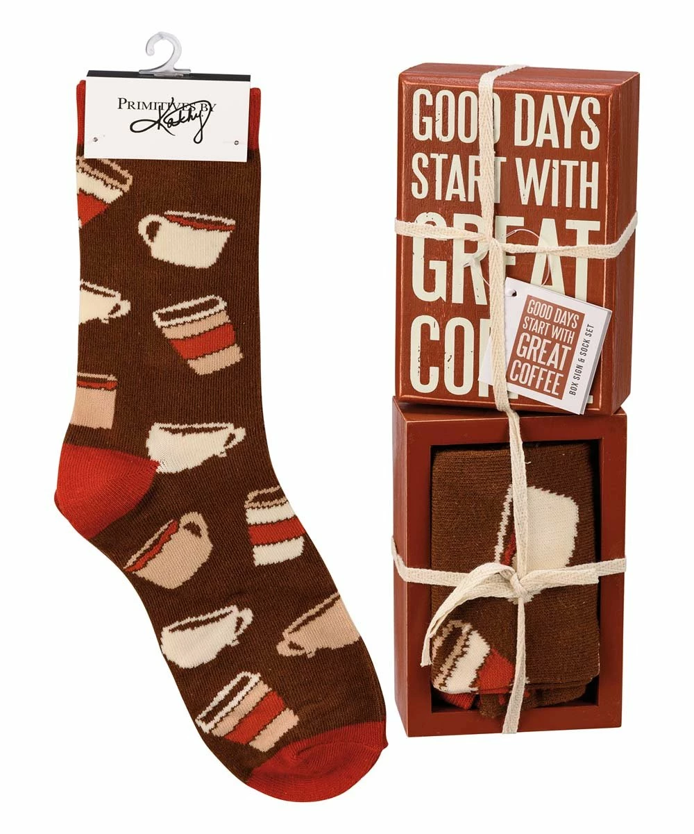 Show off your love for all things coffee with this set of stretch-infused socks and coordinating box sign.