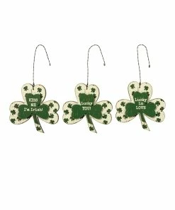 Show off your Irish pride with these festive shamrock ornaments crafted from wood boasting cheerful messages.