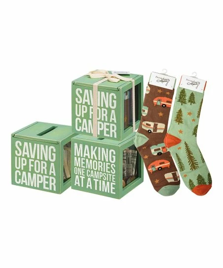 Treat yourself, family or friends to the goal-setting style of this set that includes a box-shaped bank and two pairs of theme-related socks.