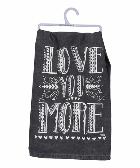 Lend a loving note to your kitchen décor with this dish towel displaying a heartwarming phrase.