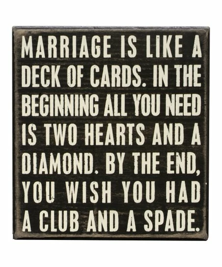 - Full graphic text: Marriage is like a deck of cards. In the beginning all you need is two hearts and a diamond. By the end, you wish you had a club and a spade.