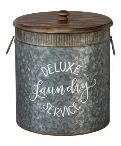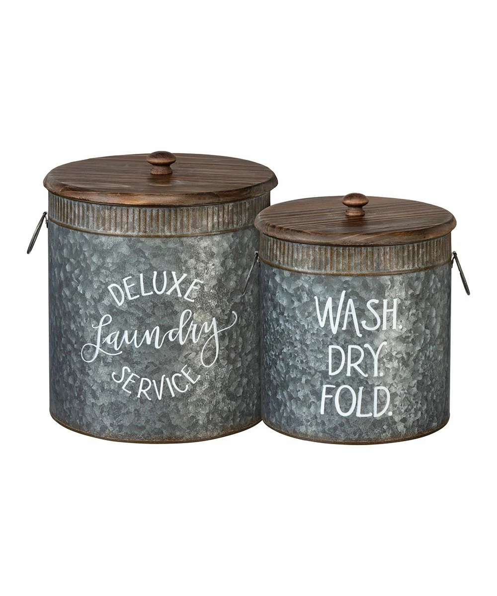 Outfit your laundry room with this rustic pair of metal tins adorned with vintage-inpsired labels.