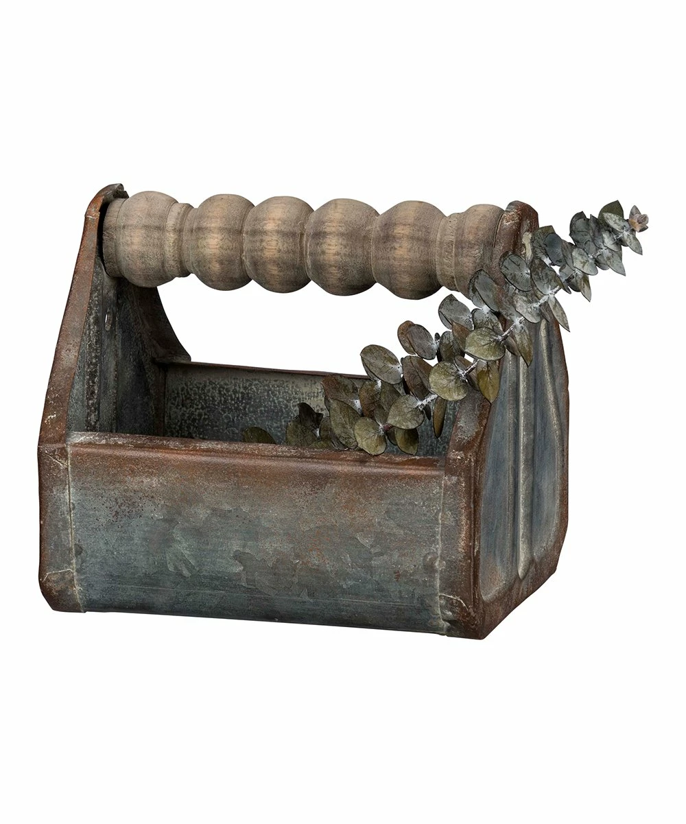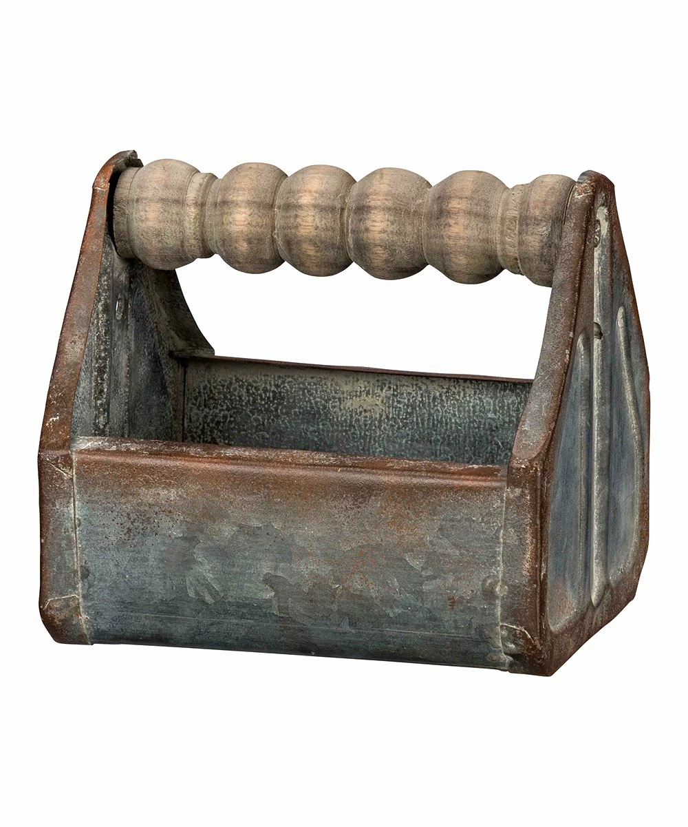Bring order to your odds and ends or display flowers with the rustic charm of this metal and wood-handled tray.