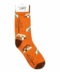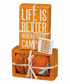 - Includes one pair of orange camping socks, orange block sign and orange gift box (three pieces total)