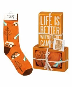 - Includes one pair of orange camping socks, orange block sign and orange gift box (three pieces total)