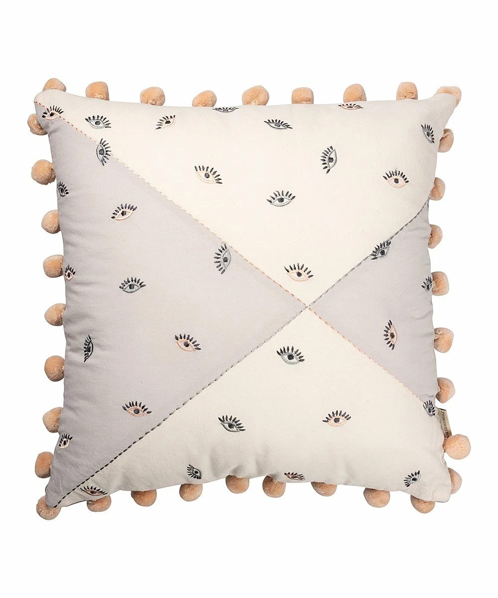 Instantly transform your bedroom or living room into a welcoming bohemian paradise with this throw pillow that features a whimsical eye pattern and pom-pom trim.