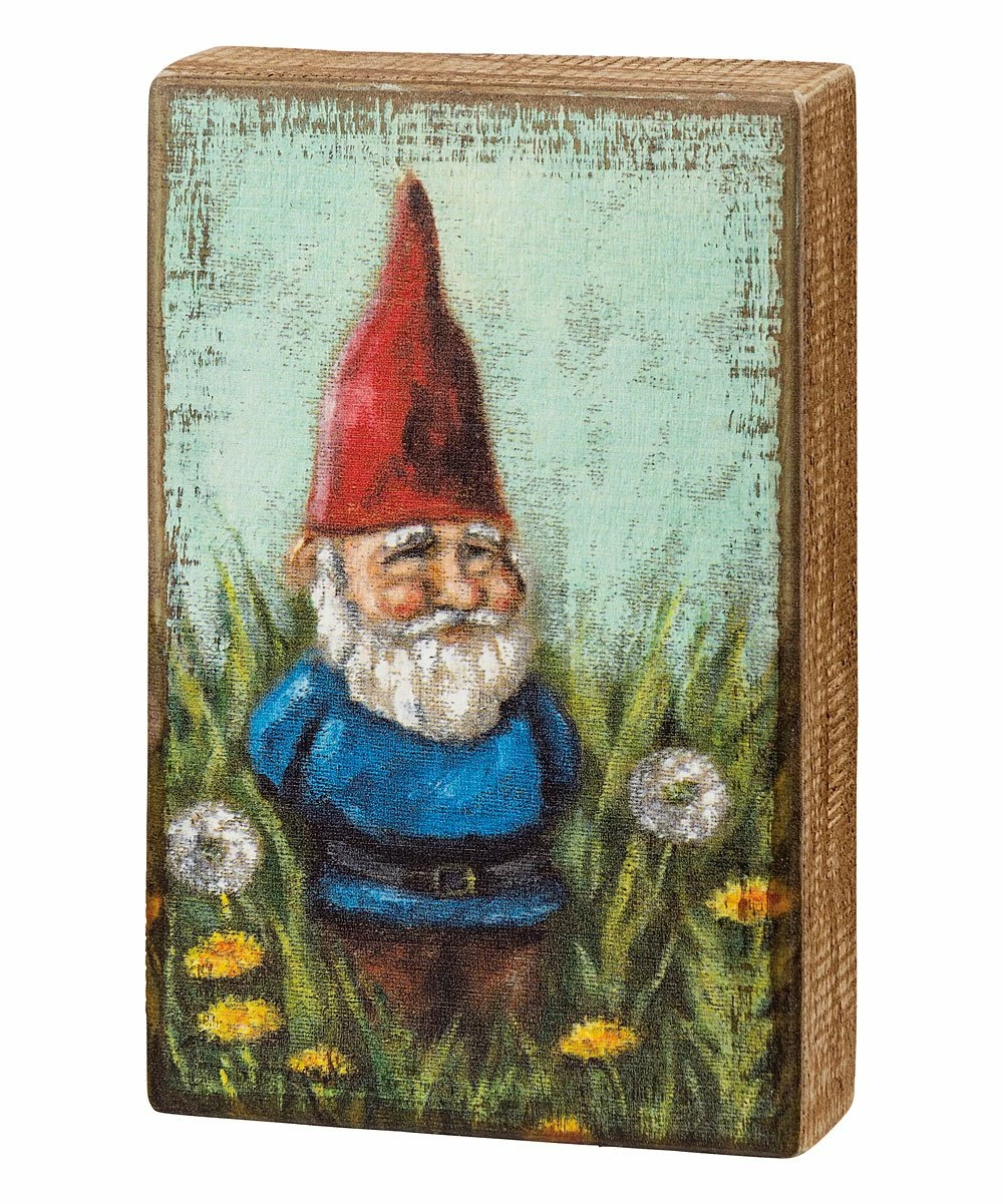Give your home some playful spirit by displaying this rustic wood box sign that showcases a whimsical gnome motif.