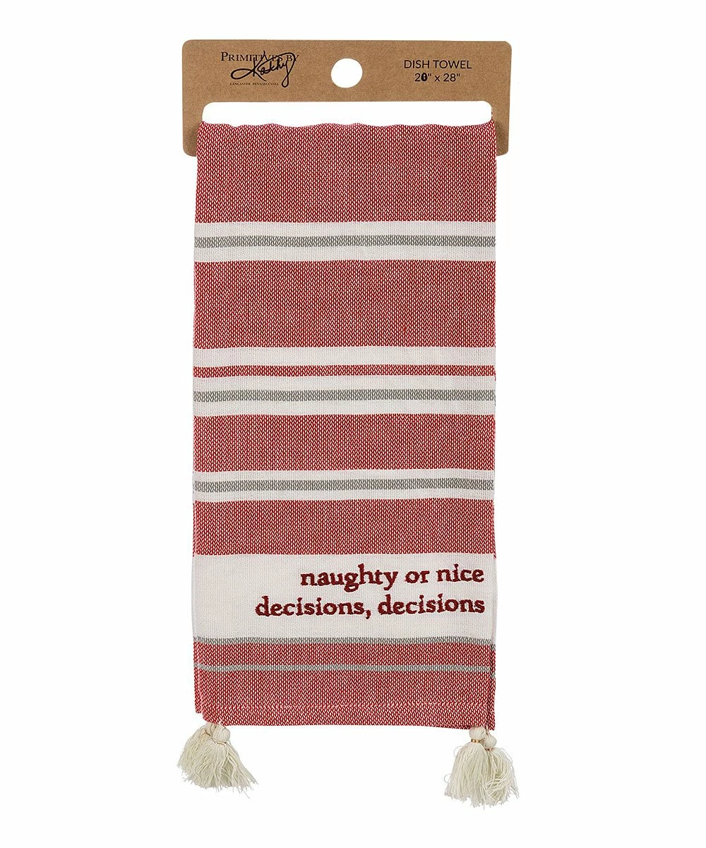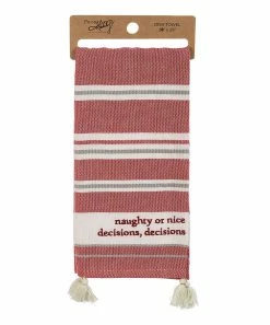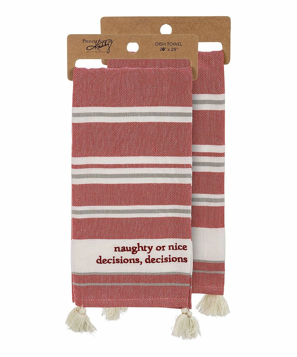 Accent kitchens with festive appeal using this dish towel’s stripe design, tassel details and playful message.