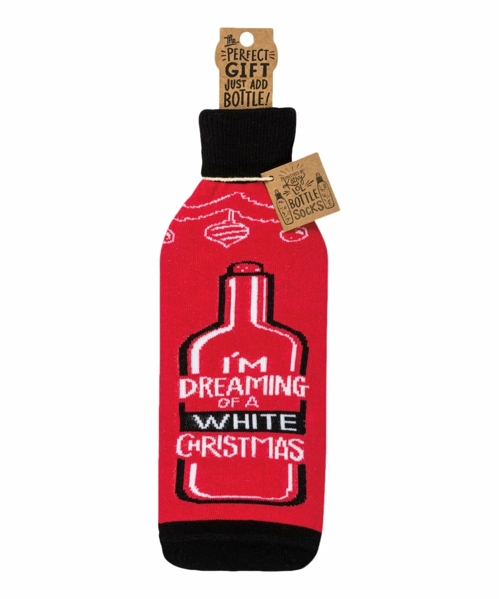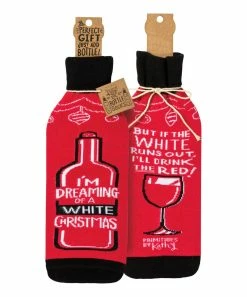 A cotton-blend bottle sleeve with a jolly Christmas-themed message.