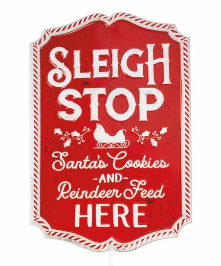 - Full graphic text: Sleigh stop. Santa’s cookies and reindeer feed here.