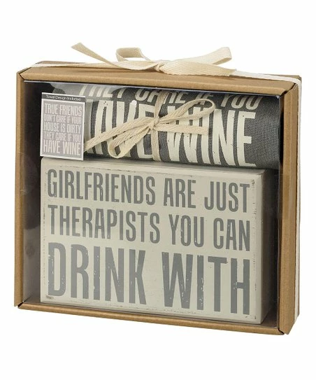 Pay nod to your favorite people with this coordinated box sign and towel set that’s sure to inspire laughs and maybe a few drinks.