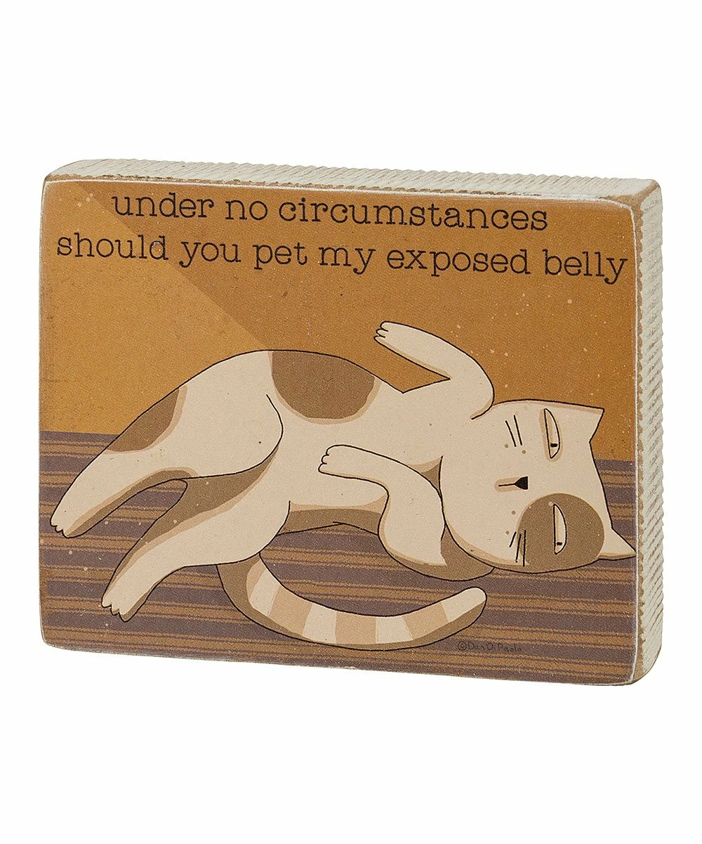 Adorably accent your home décor with this block sign, featuring a colorful feline design and a playful message.