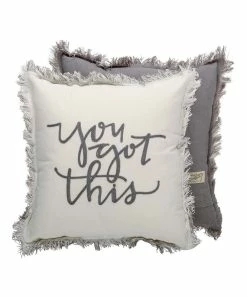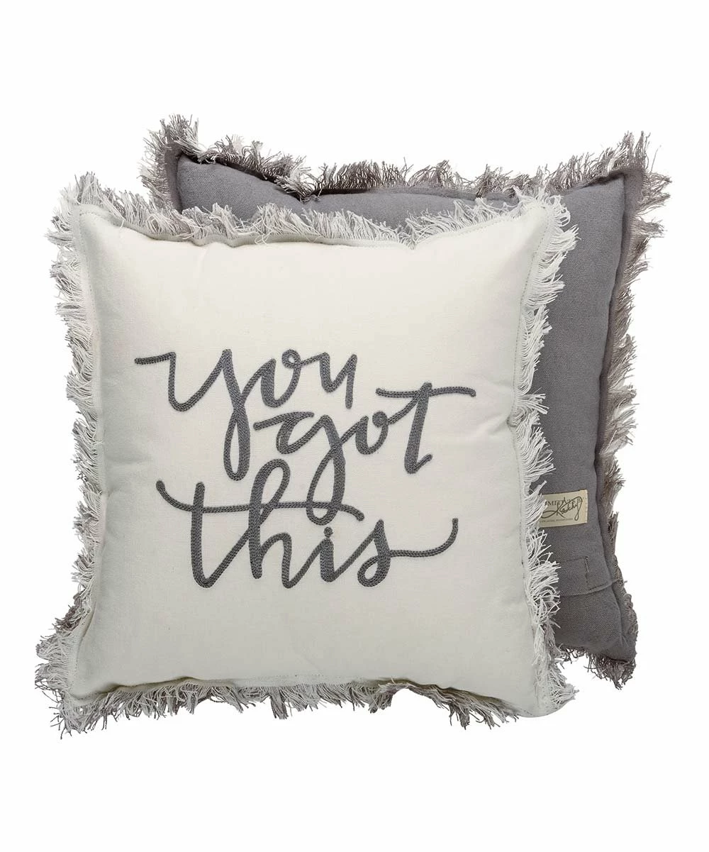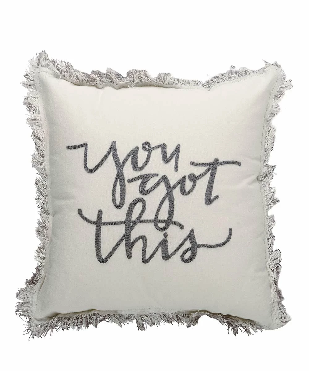 Accent sofa spaces with this throw pillow’s fringe-trim and inspirational embroidered message.
