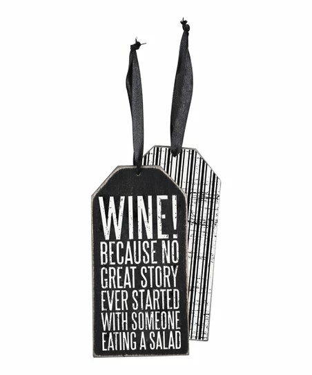 Give the gift of vintage-inspired cheer with this charming wood tag that expresses a whimsical wine-themed sentiment.