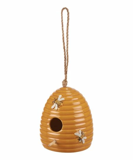 Beehive-shaped birdhouse décor made from durable ceramic with a jute thread for hanging.